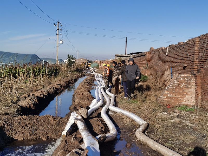 由于該村緊鄰象峪河,因河道水位持續高漲,村內積水無法自然排出,導致近98萬平方米耕地被淹,總積水量約為60萬立方米。搶險突擊隊以里旺村小區西側耕地最低點為起點,呈樹枝狀布置水泵,以村莊東處的象峪河為排水末端,通過最低點水泵提升、中端水泵轉輸、末端水泵強排的三級聯排,并利用地形高差、開溝槽下管引流等方式降低耕地整體水位。經過六天的晝夜奮戰,截止10月18日晚,抽排積水約17萬立方米,積水面消退約15萬平方米,疏導退水渠約1400米。