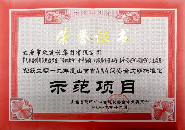2019年12月25日,由集團公司承建的“軍民融合創新基地起步區‘兩縱兩橫’骨干網絡—柏板路建設工程(不含K0+590-K0+950上蘭路段)”榮獲山西省建筑業協會建筑安全專業委員會頒發的“2019年度山西省AAA級安全文明標準化示范項目”榮譽稱號。