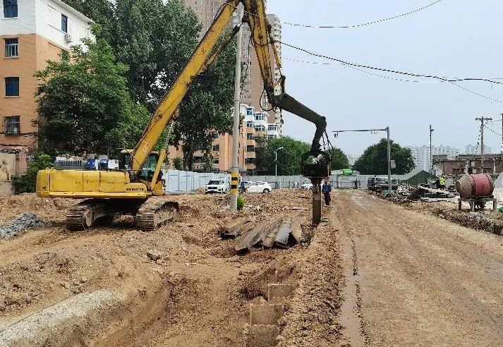 除迎新街北段外,其他道路在溝槽開挖時,都需要在施工過程中對老舊居民樓進行保護。項目部經過仔細研究后,決定在建筑物旁采用兩排高壓旋噴樁進行隔離保護,減少施工對老舊建筑物的影響,確保工程安全。面對地下管線復雜的情況,項目部積極聯系業主,多次與煤氣、自來水、供熱等公司溝通協調,最終對影響施工的管線進行改遷,為工程順利施工奠定了基礎。同時,迎新西一條施工范圍內有十余根高壓電線桿,緊鄰雨污水管,因電線桿短期內無法遷移,若進行溝槽開挖,存在極大安全隱患,為確保施工安全,項目部采用打鋼板樁的方式對電線桿進行保護,順利解決了施工難題。