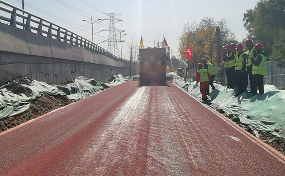 十一月的汾河,秋意正濃、萬籟無聲,濱河自行車專用道工程一標段的施工現場卻依舊熱火朝天,沿線隨處可見施工人員身穿工作服、頭戴安全帽的忙碌身影。隨著一標段道路部分最上層彩色涂層開始鋪裝,項目部正式進入決勝攻堅階段。預計一標段將于11月底完工。