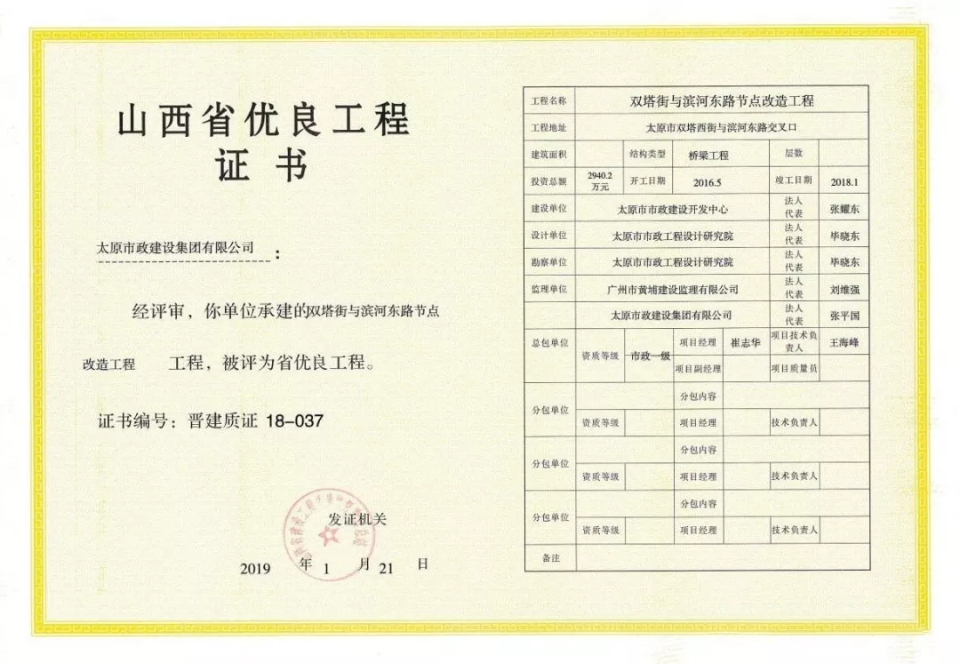 太原市政建設(shè)集團(tuán)有限公司雙塔街與濱河?xùn)|路節(jié)點改造工程榮獲“山西省優(yōu)良工程”榮譽(yù)稱號